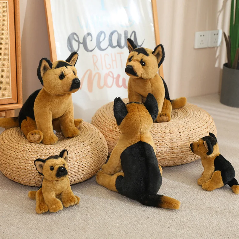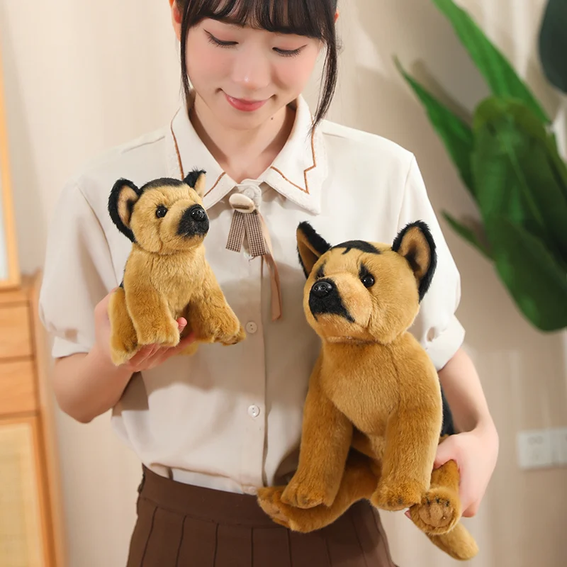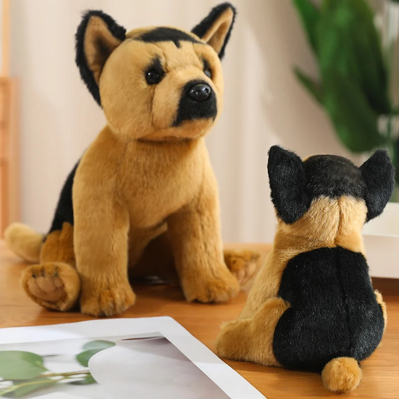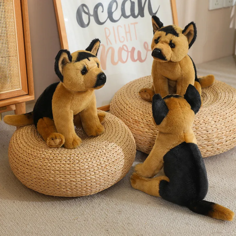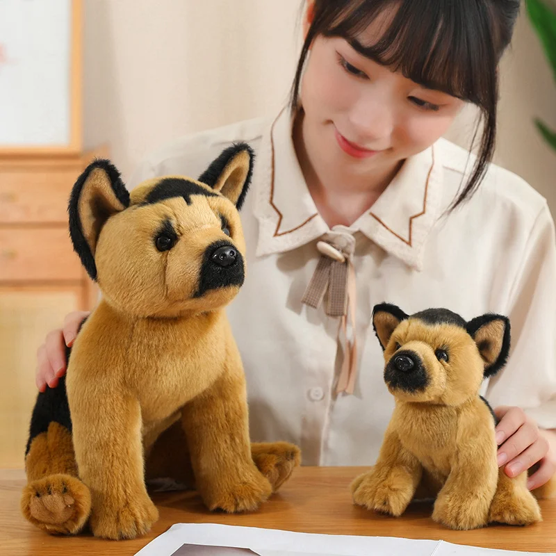 Realistic Breed Representation: The plush is designed to resemble a German Shepherd puppy, featuring the breed's signature tan coat with black markings on the muzzle, ears, and forehead.